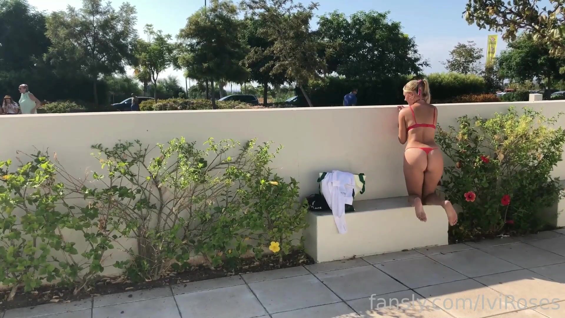 Iviroses Flashing in public plaza in red lingerie and BUTT PLUG!