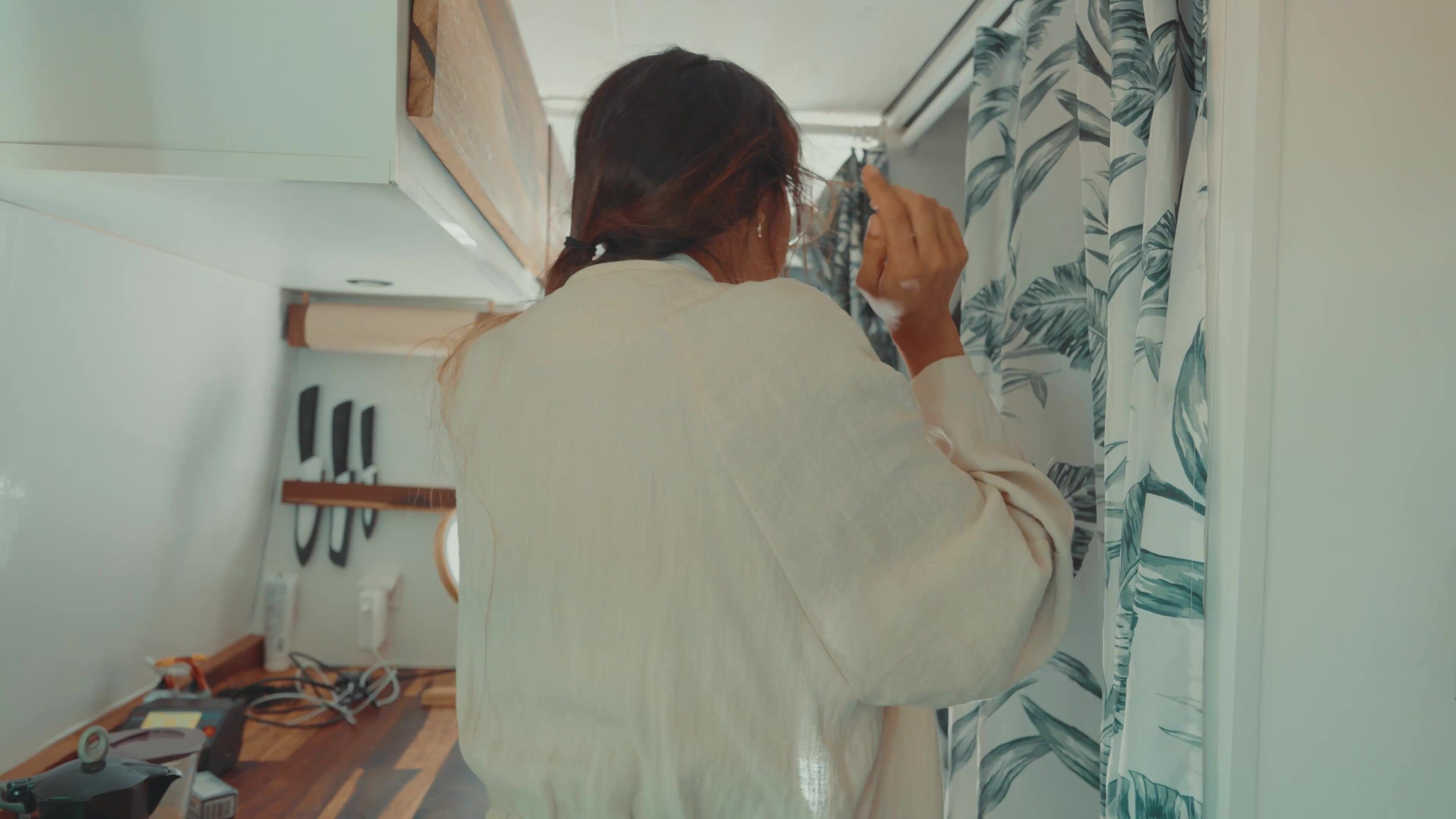 Natalie Roush try-on squats over camera